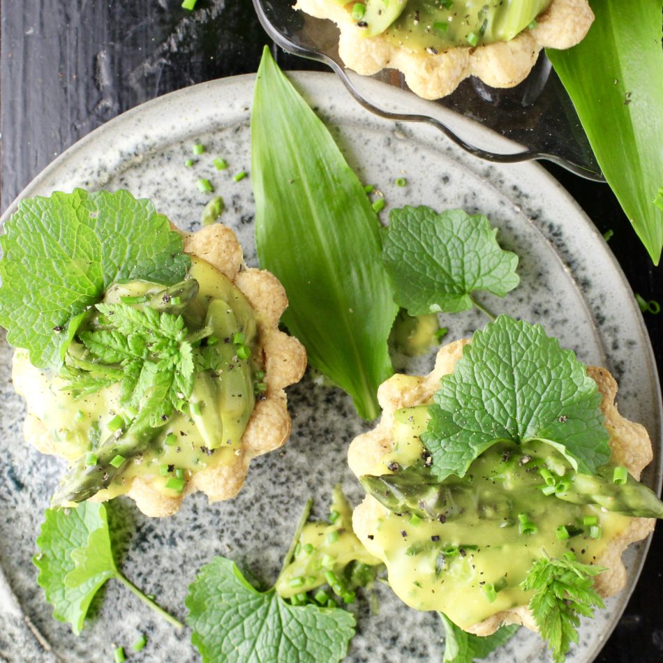 Tilbage til lækkerierne. Denne version tarteletfyld er inspireret af foråret. I vores have har jeg plantet og sået løgkarse, sødskærm og ramsløg. Jeg glædes dagligt, her i det tidlige forår, over at kunne gå ud og hente lidt grønt. Derfor har jeg ud over grønne asparges, tilføjet både ramsløg og løgkarse til denne aspargesstuvning.