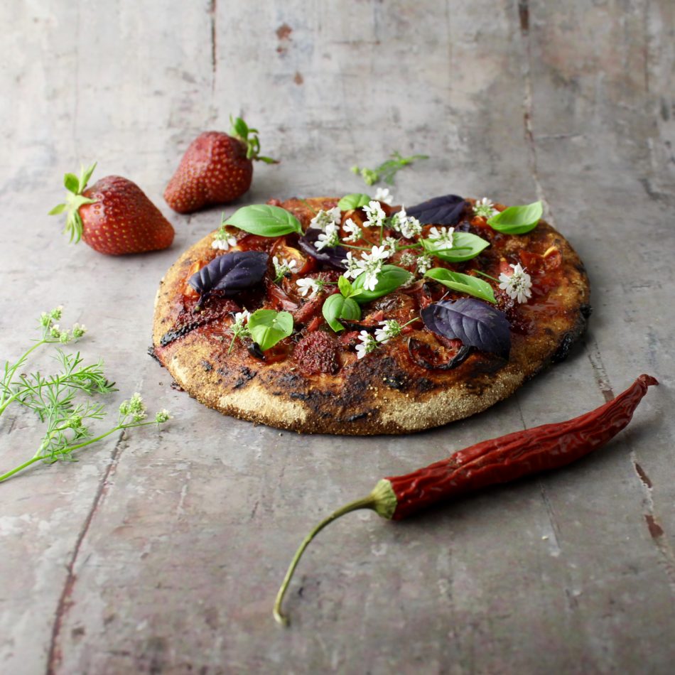 Skyl jordbær og cherrytomater. Fjern stilken fra dem. Skær jordbærrene i kvarte og tometerne i halve. Rens chilierne for kerner og skær dem i bitte små stykker. Rør ahornsirup, olivenolie, balsamico, chili, salt og peber sammen og smag til. Fordel nu først jordbær og cherrytomeater over de ubagte bunde med tomatpastaen. Derefter fordeles den sur, søde, stærke og salte blanding ud over pizzaen el. pizzaerne.