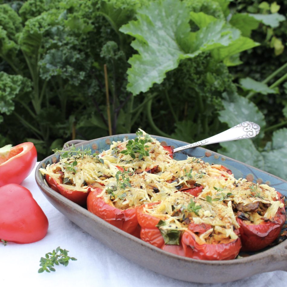 Jeg valgte at fylde dem med en blanding af markchampignon, squash, løg, hvidløg, sorte bønner, ris og datterino tomater. Ovenpå kom jeg revet plantebaseret pizzaost. De blev krydret med et blandingskrydderi som jeg fandt i skabet og som jeg synes smager rigtig lækkert og så med citrontimian fra haven.