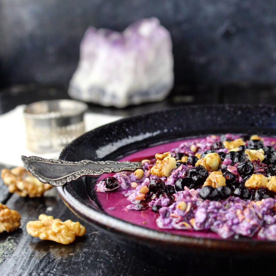 Denne version er med grove havregryn, hel boghvede, chiafrø, dadler, valnødder og vilde blåbær. Den har den smukkeste lilla farve fra de vilde blåbær. Og så er den fuld af gode næringsstoffer. Næring til krop og sanser. Gode fibre og mineraler fra havren og boghveden, som begge fra naturens side er glutenfrie. Havren skal blot være købt som en glutenfri version, da normale havregryn kan være blevet blandet med andre kornsorter og derfor skal være håndteret specielt fra landmand og mølleri.