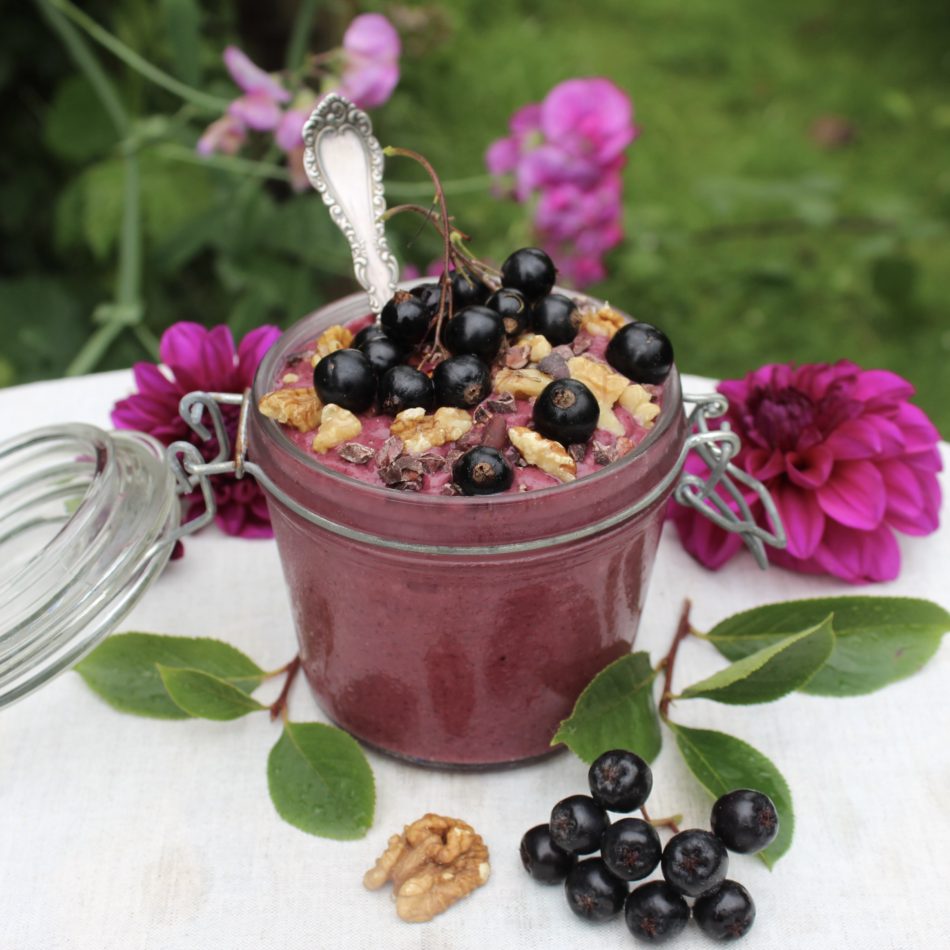 Denne smoothie bowl er spækket med antioxidanter, saft og kraft. Den indeholder bla. solbær og aroniabær, som vokser herhjemme i Danmark og som er utroligt kraftfulde. Den indeholder bananer som er basen i det fleste af mine smoothiebowls. Bananer indeholder en del kalium, B6 vitamin og fibre. Udover bær og bananer, indeholder den også kikærter, for at tilføre noget protein og nogle fibre. Mandler, valnødder og kokosmel for at få de gode fedtsyrer og nogle få dadler for at tilføre lidt ekstra naturlig sødme. Den indeholder også noget acaipulver, som sagtens kan undværes, men som jeg tilsatte for at give bowlen et ekstra boost. Acaibærrene indeholder bla. dobbelt så mange antioxidanter som blåbær. Så hvis du har brug for et ekstra boost kan du jo tilsætte det også.