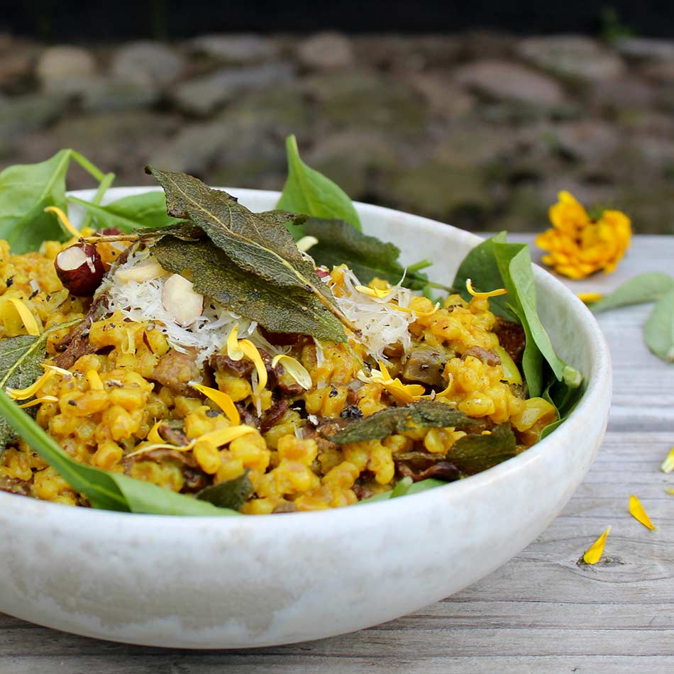 Risotto, speltotto, bygotto og rugotto er en rigtig dejlig og mættende efterårsret. I denne ret, har jeg brugt, perlespelt, markchampignon, kantareller, hasselnødder og salvie. En super lækker smagskombination. Og en totalt lækker konsistens. Blød og lækker med bid fra hasselnødderne og perlespelten og knas fra de stegte salvieblade.