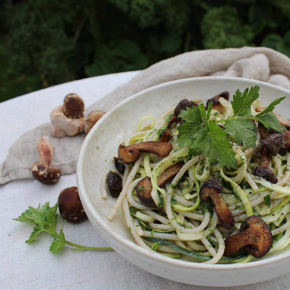 Bland nu de to slags spaghetti med persilledressingen. Anret det på to store eller 4 små tallerkner. Anret de stegte shitakesvampe på portionerne og pynt med frisk persille på toppen.