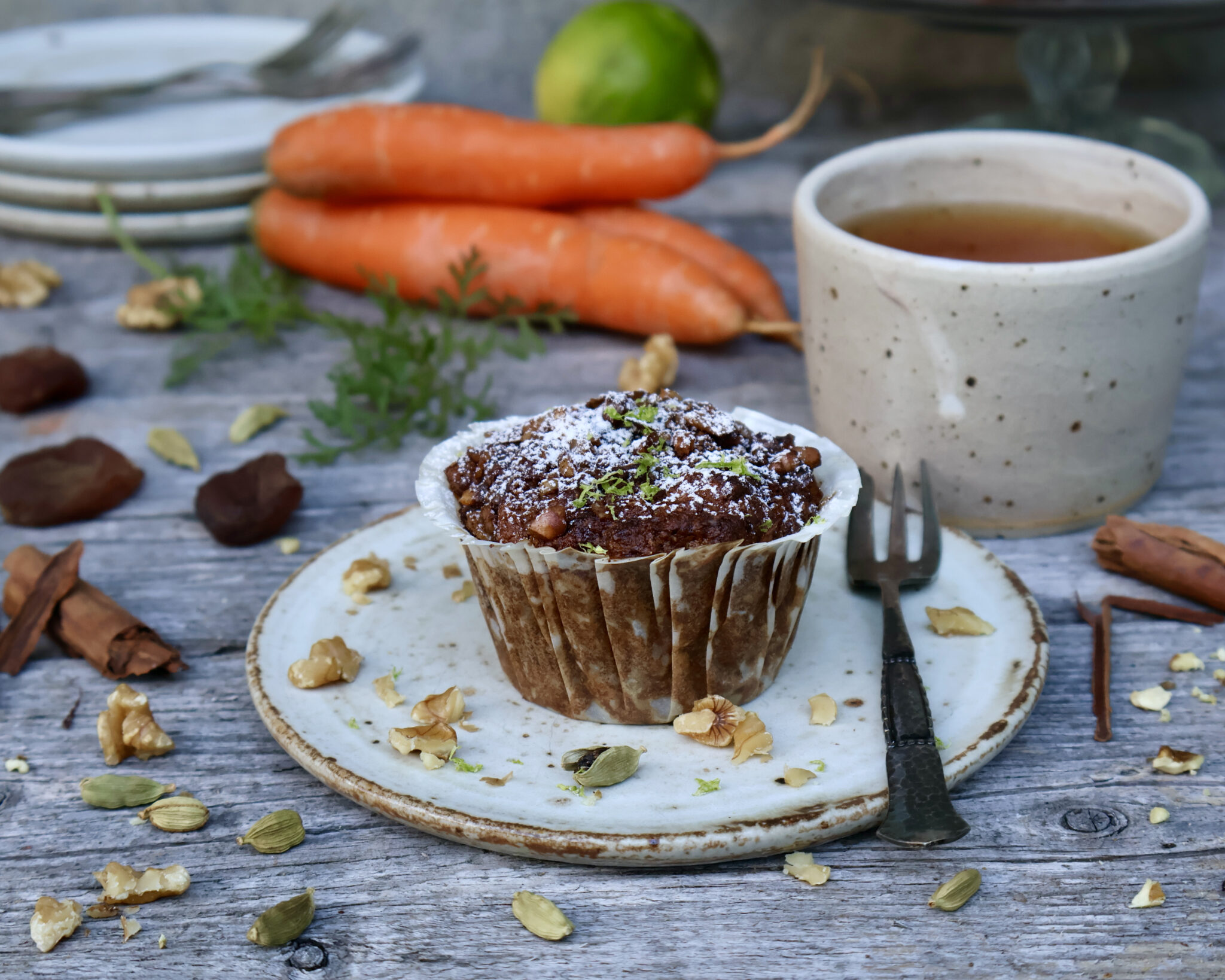 Så er der en ny opskrift på bløde og svampede gulerodsmuffins på bloggen. Noget af sødmen kommer naturligt fra gulerødderne og abrikoserne, resten fra kokossukkeret. Kanel og kardemomme tilfører varme og søde smagsnoter og de hakkede valnødder lækkert knas. Alt i alt en dejlig muffin med masser af smag og gode nærende ingredienser.