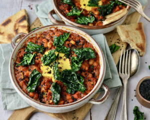 Jeg har tilladt mig den kreative frihed at kalde denne ret for Shakshuka, selvom der er lavet en del om i den originale opskrift. Der er brugt rodfrugter og palmekål i stedet for rød peber og squash, for at bruge årstidens lokale grønsager. Der er også brugt kikærter i grønsagssaucen for at gøre den mere mættende og proteinrig. Æggene er skiftet ud med en masse lavet af tofu. Retten er ment som en varm middagsret som er lækker at spise med et godt stykke surdejsbrød eller et fladbrød. Jeg har ladet mig fortælle at Shakshuka oprindeligt er tiltænkt at spise til morgenmad eller brunch. Spis den når du har lyst og nyd den.
